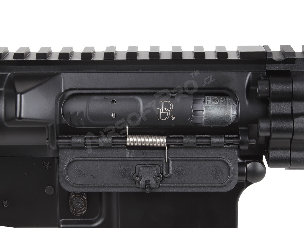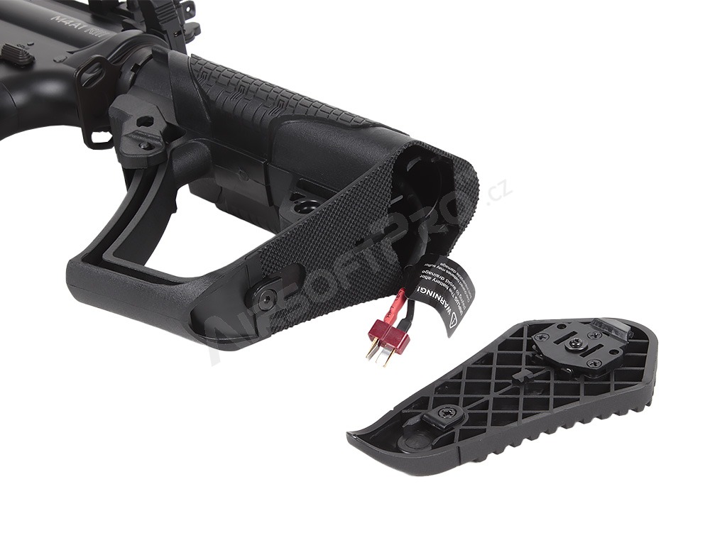 - Licencovaná výsuvná pažba Daniel Defense s pogumovanou lícnicou a rýchlo odnímateľnou topánkou pre ľahký prístup k priestoru pre akumulátor.