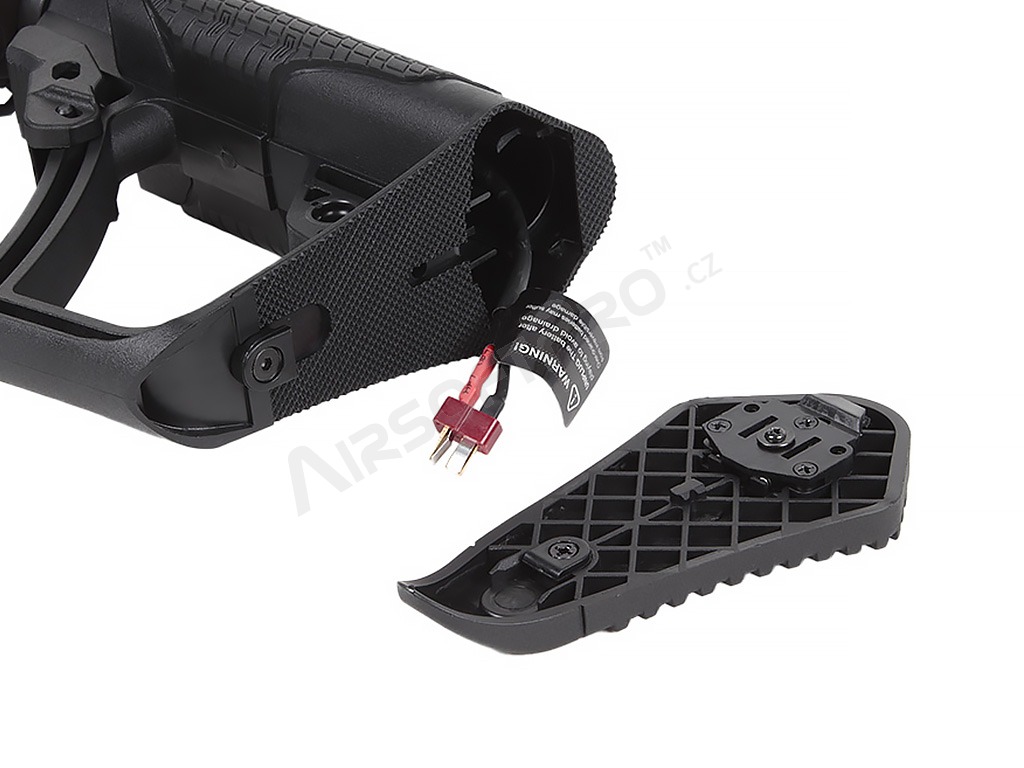 - Licencovaná výsuvná pažba Daniel Defense s pogumovanou lícnicou a rýchlo odnímateľnou topánkou pre ľahký prístup k priestoru pre akumulátor.