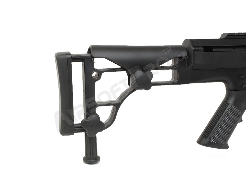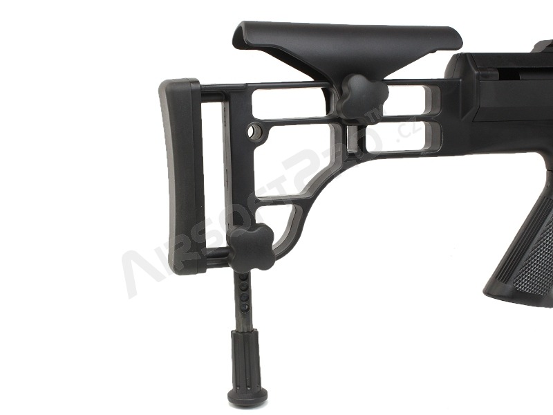 Na pažbe nájdete nastaviteľnú lícnicu z polyméru a tiež nastaviteľnú zadnú opierku, takže si zbraň jednoducho prispôsobíte svojej polohe aj výstroju.
