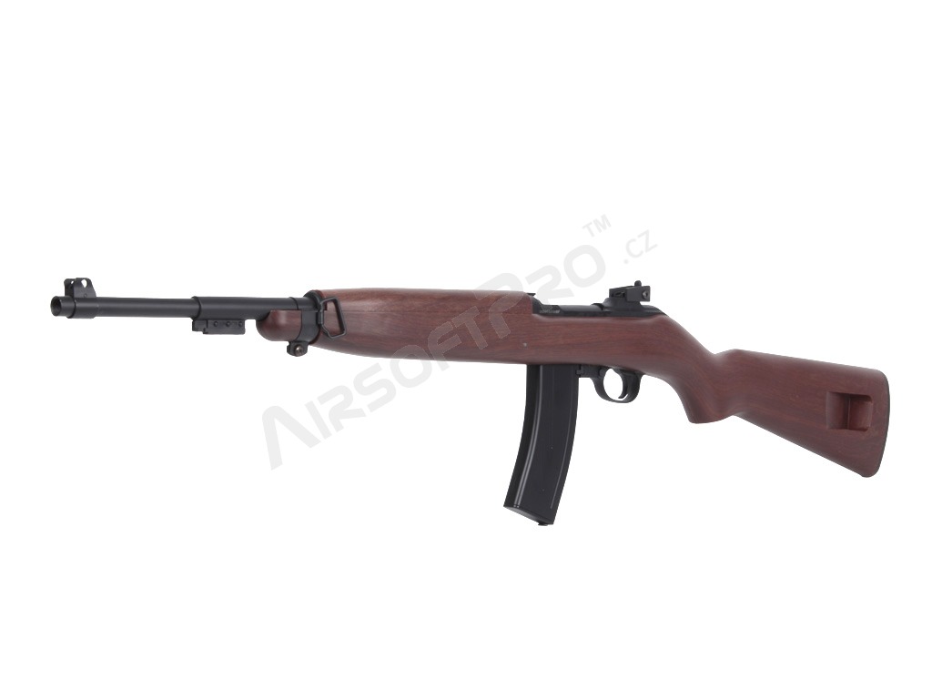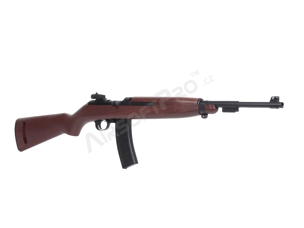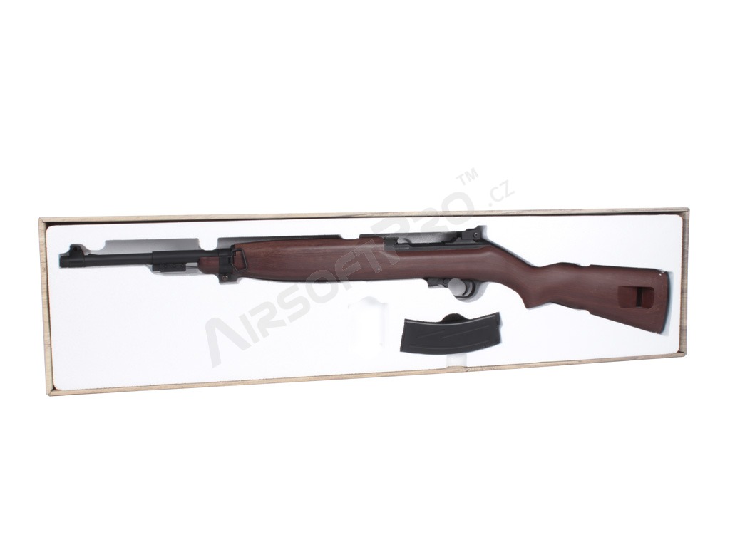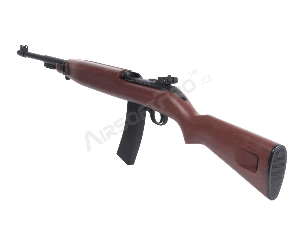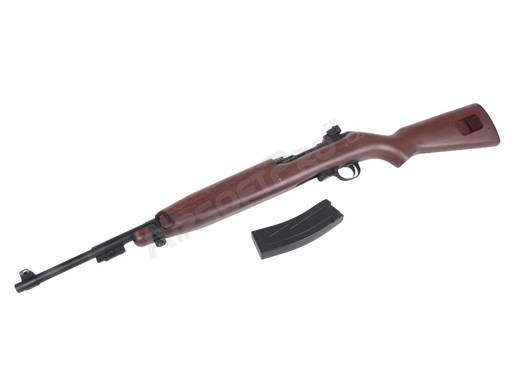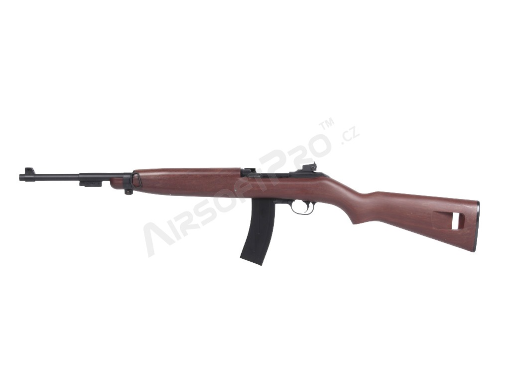 Airoftová zbraň M1 Carbine SPG, manuál - imitácia dreva [AGM] História M1 Carbine: M1 Carbine (United States Carbine, Caliber .30, M1) je ľahká samonabíjacia karabína, ktorá sa počas 2. svetovej vojny rýchlo stala štandardnou výzbrojou amerických vojakov. Vďaka jednoduchosti, nízkej hmotnosti a kompaktnej konštrukcii si získala obľubu aj v kórejskej a vietnamskej vojne; vyvinuli sa varianty s plne automatickým režimom (M2) alebo s prídavným infračerveným zameriavačom (M3). Na rozdiel od mnohých karabín bola M1 navrhnutá ako samostatný systém a stala sa rozšírenou vo vojenskom, policajnom aj civilnom sektore. Táto replika prináša klasický vzhľad karabíny do sveta airsoftu — inšpirovaná originálom, nie ako presná historická kópia.