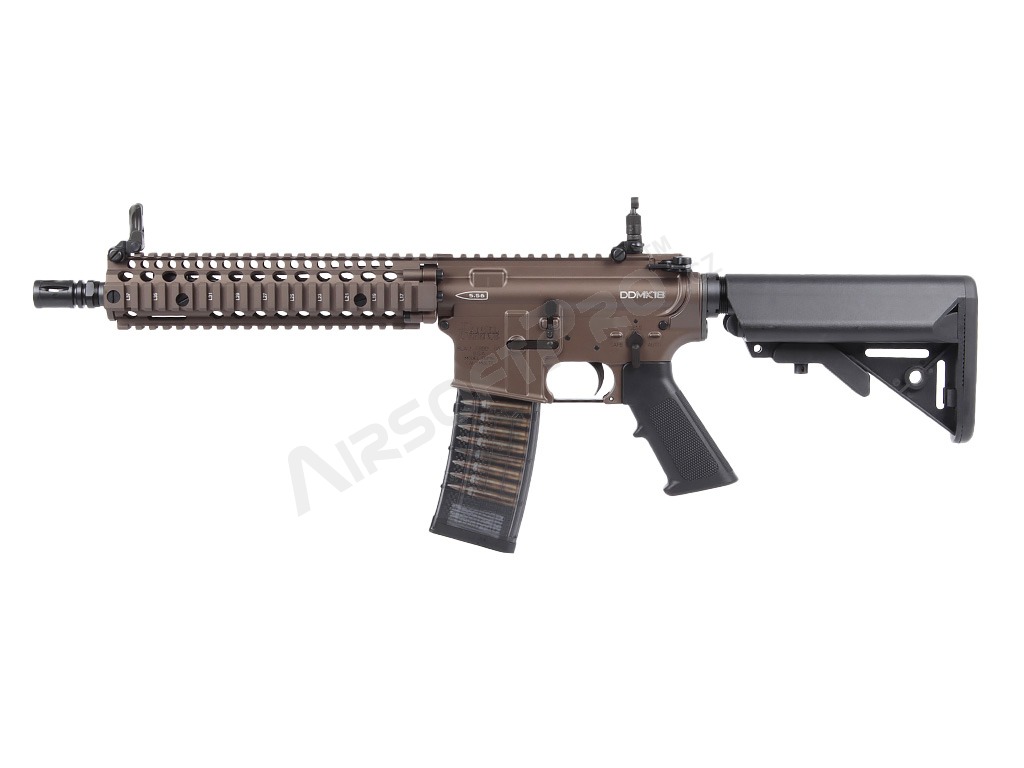 Airsoftová GBB zbraň Daniel Defense MK18 10,5", plyn blowback CGS - FDE [CYMA] Platforma AR-15, pôvodne navrhnutá spoločnosťou ArmaLite, prešla počas rokov nespočetnými evolúciami a stala sa nepostrádateľnou voľbou pre vojenské a policajné jednotky i civilných nadšencov po celom svete. Variant MK18 s licencovaným predpažbím Daniel Defense RIS II predstavuje jeden z najikonickejších modelov používaných špeciálnymi jednotkami.