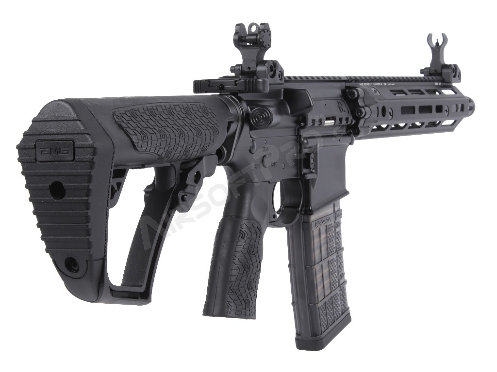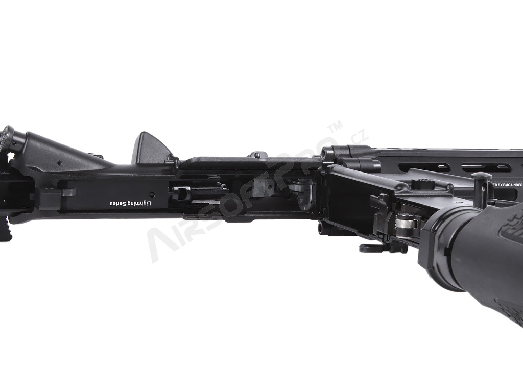 Kompaktná 9,5" vonkajšia hlaveň robí z tejto pušky ideálny nástroj pre CQB aj boj na stredné vzdialenosti. Zbraň je osadená nastaviteľnou pažbou EMG "ETA" a ergonomickou pažbičkou. Autentickosť dopĺňa licencovaný tlačný zásobník Lancer Systems L5 AWM na 30 rán s realistickým značením.