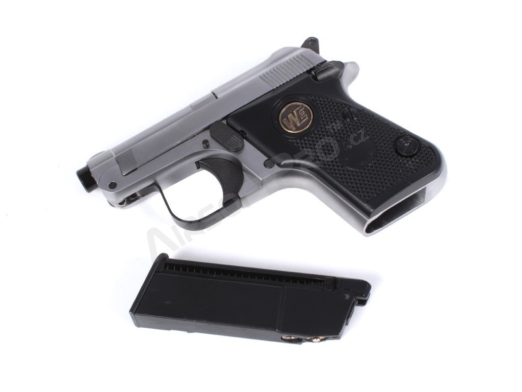 Airsoftová pištoľ 950 GBB, celokov - strieborná [WE] Beretta 950 je poloautomatická pištoľ navrhnutá a vyrábaná spoločnosťou Beretta od roku 1952. Nadväzuje na dlhý rad malých a kompaktných vreckových pištolí vyrábaných spoločnosťou Beretta pre sebaobranu. Bola koncipovaná ako veľmi jednoduchá a spoľahlivá vrecková pištoľ.