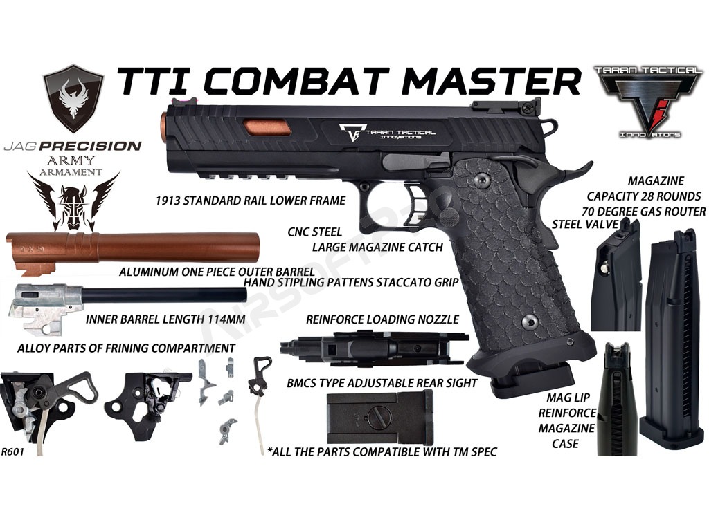 Pistola R601 JAG TTI Combat Master známa z filmu John Wick 3 je oficiálne licencovaná replika vytvorená v spolupráci spoločností JAG Precision a Taran Tactical Innovations (TTI). Táto pištoľ predstavuje dokonalú rovnováhu medzi agresívnym dizajnom a funkčnou ergonómiou, určenou pre náročných hráčov airsoftu aj zberateľov.
