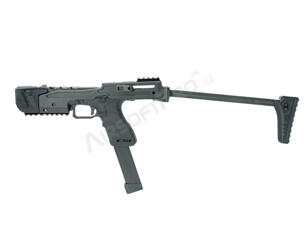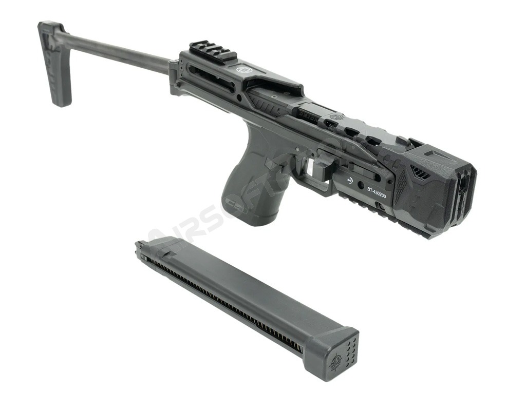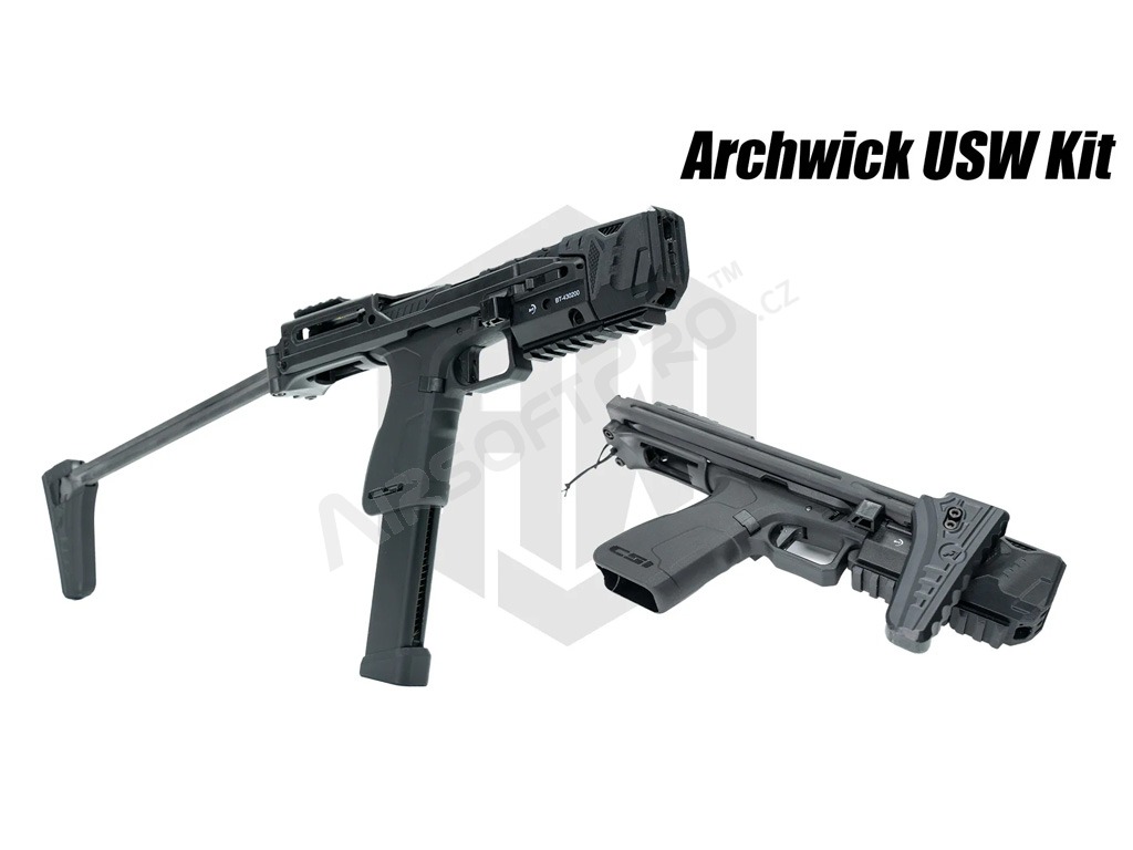 Konverzný kit B&T USW je vyrobený z polyméru vystuženého sklenými vláknami a nesie oficiálne razenie a logá B&T. Sklopná pažba umožňuje bleskovú zmenu z kompaktnej pištole na stabilnú platformu pre presnú streľbu na dlhšiu vzdialenosť.