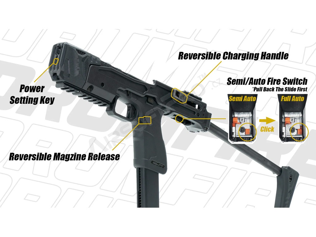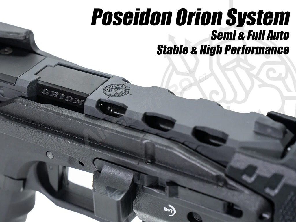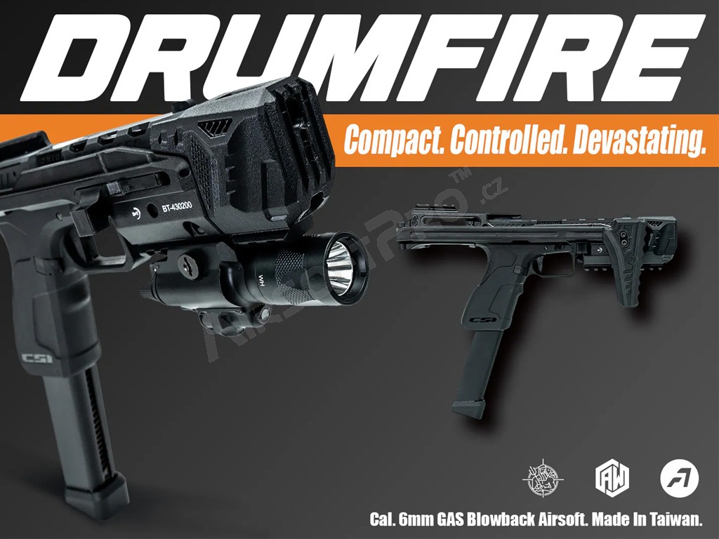Pistole disponuje precíznym záverom Poseidon Orion a ľahkým, ale extrémne odolným telom kompletne vyrobených z odolného nylonu. RMR monáž na hornej strane záveru (nie je možné pritom použiť sklopnú pažbu) alebo RIS lišta na sklopnej pažbe umožňujú jednoduchú inštaláciu kolimátora. Vďaka vstavanému systému prepínača streľby môžete ľahko prepínať medzi režimami Semi (jednotlivo) a Full Auto (dávka), čo z Drumfire robí nebezpečného protivníka v CQB scenároch.