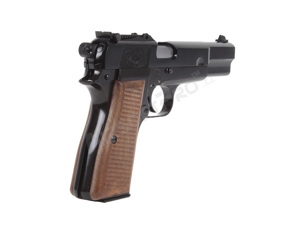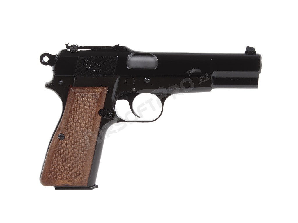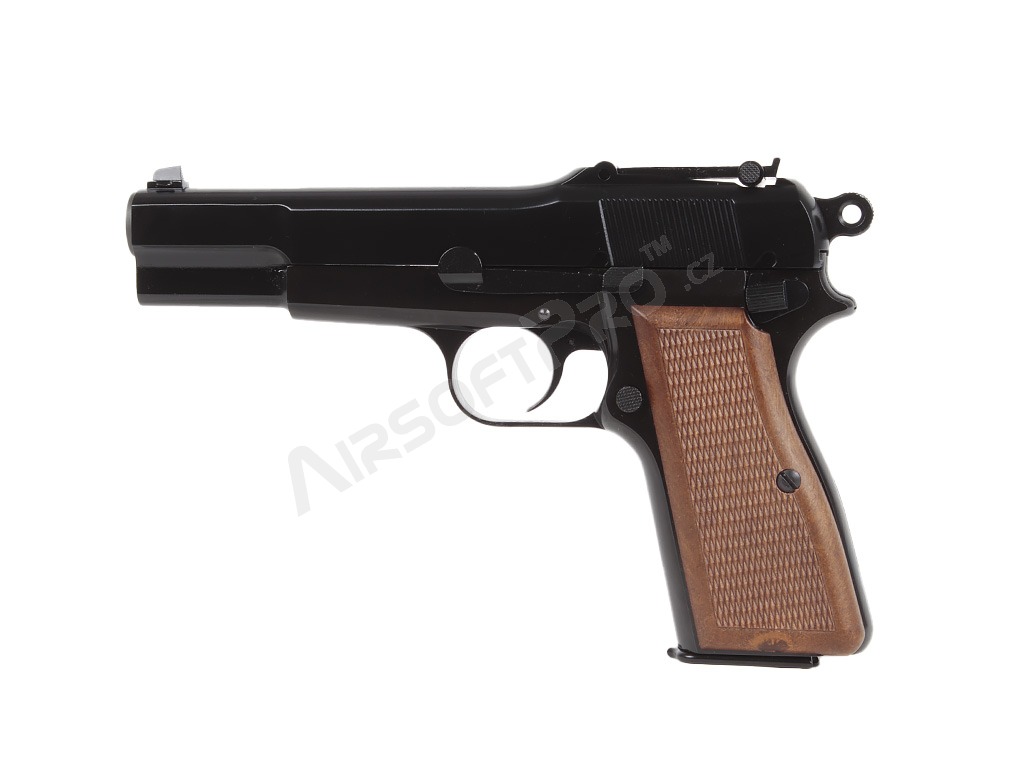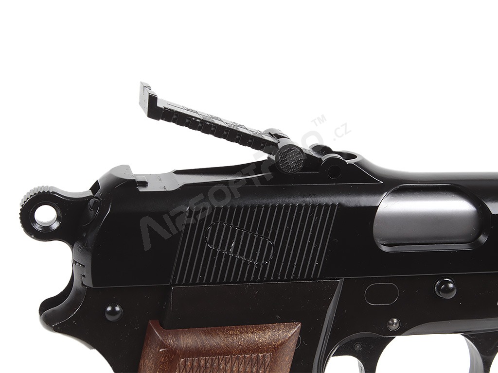 Airsoftová verzia pištole Browning Hi-power M1935 s prídavnou pažbou je perfektne prepracovaná a celokovová replika v čiernom prevedení.