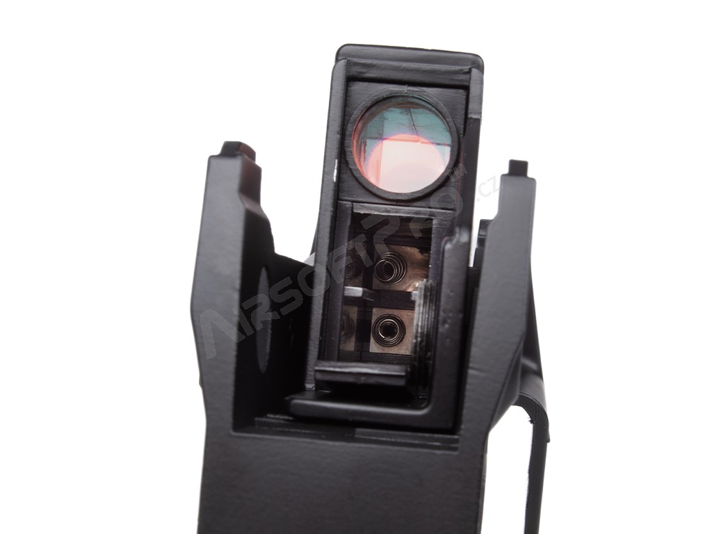 Vstavaný kolimátor s červenou bodkou umožňuje rýchle a presné mierenie. Vďaka dvom úrovniam jasu si ľahko prispôsobíte intenzitu bodu podľa svetelných podmienok. Kolimátor je plne nastaviteľný stranovo aj výškovo, takže ho môžete presne doladiť na svoju repliku. Napájanie zabezpečujú dve bežné AAA batérie (nie sú súčasťou balenia). Ľahká a odolná kovová konštrukcia zaručuje dlhú životnosť a autentický vzhľad.