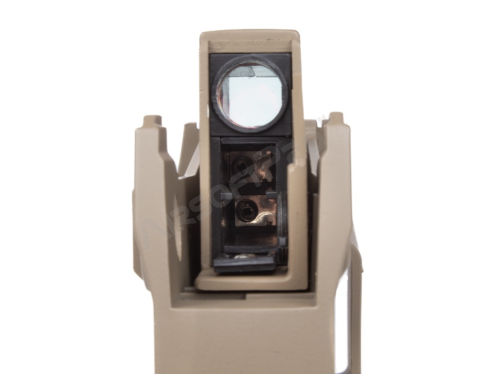 Vstavaný kolimátor s červenou bodkou umožňuje rýchle a presné mierenie. Vďaka dvom úrovniam jasu si ľahko prispôsobíte intenzitu bodu podľa svetelných podmienok. Kolimátor je plne nastaviteľný stranovo aj výškovo, takže ho môžete presne doladiť na svoju repliku. Napájanie zabezpečujú dve bežné AAA batérie (nie sú súčasťou balenia). Ľahká a odolná kovová konštrukcia zaručuje dlhú životnosť a autentický vzhľad.