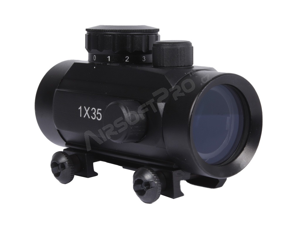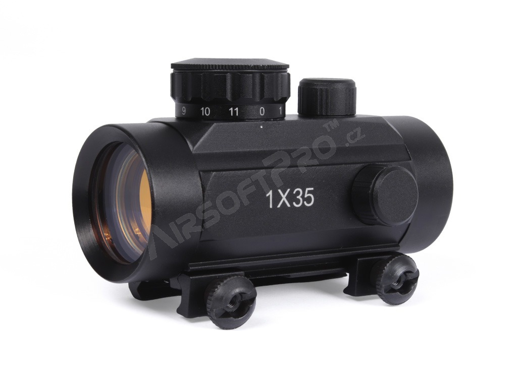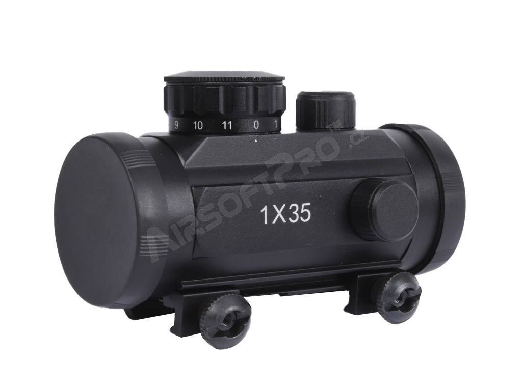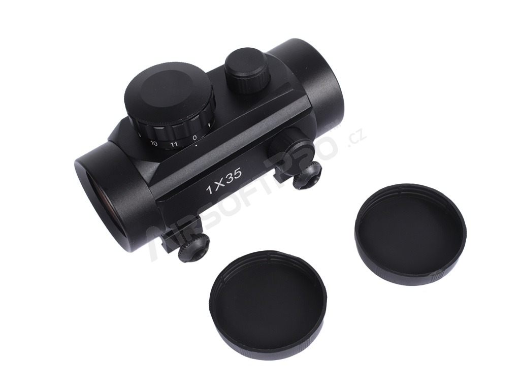 Tubusový kolimátor 1x35 s odklápacími krytkami [A.C.M.] Celokovový tubusový kolimátor pre ľahkú montáž na bežnú RIS koľajnicu. Je vybavený červeným bodom a umožňuje regulovať jeho intenzitu. Kolimátor je napájaný jednou batériou CR2032, ktorá je súčasťou balenia. Súčasťou balenia sú aj dve ochranné krytky.