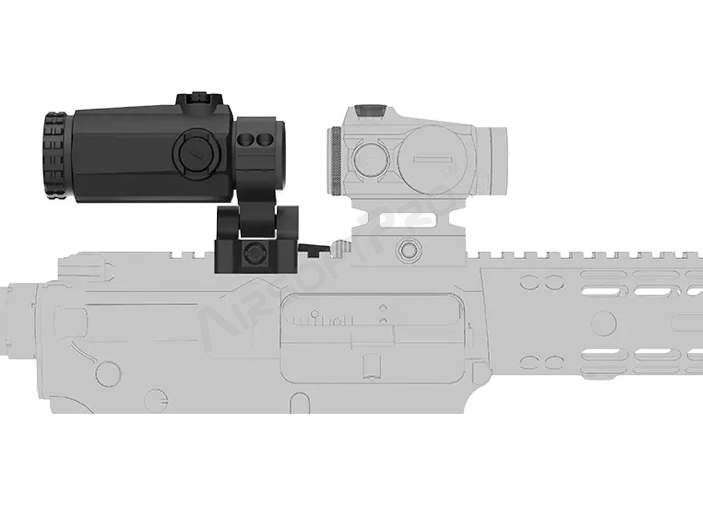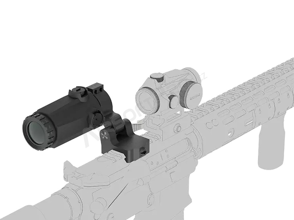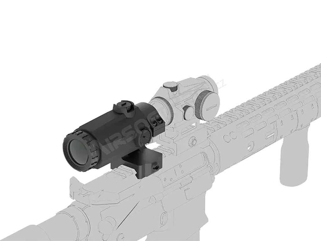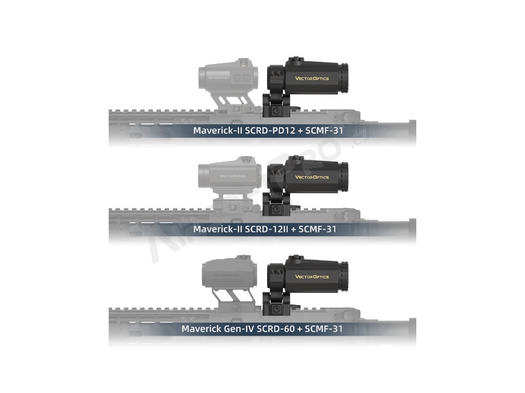 Vector Optics Maverick Gen III MIL 3x22 je zväčšovacia optika s 3x zväčšením, ktorá sa radí pred kolimátor (medzi kolimátor a strelca). Približuje cieľ pri mierení cez kolimátor na väčšiu vzdialenosť. Pri streľbe na kratšiu vzdialenosť je možné jednoducho odklopiť na stranu a mieriť ďalej iba cez kolimátor.