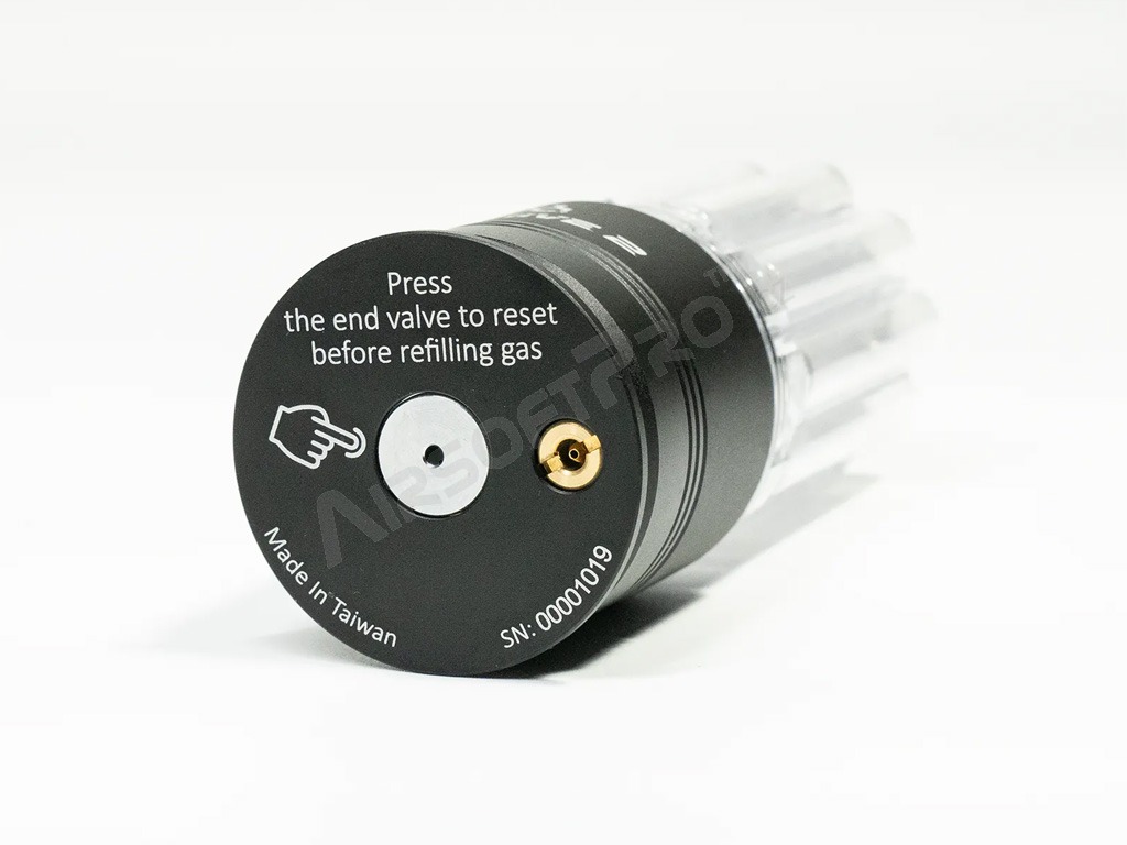 Telo granátu je vyrobené na CNC strojoch zo zliatiny hliníka, zásobník guličiek je z priehľadného plastu.