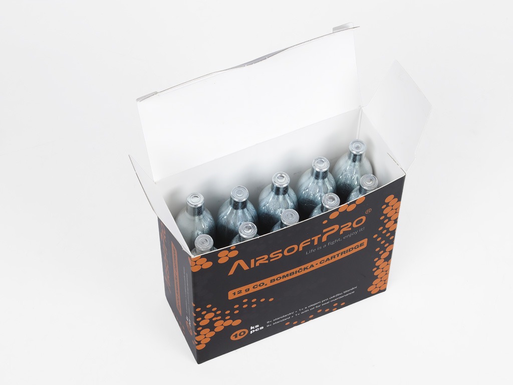 AirsoftPro sada desiatich 12 gramových CO2 bombičiek. Skladá sa z 9 klasických a 1 bombičky so silikónovým olejom.