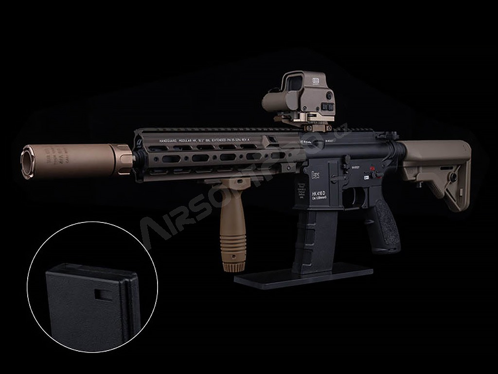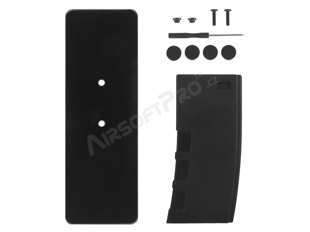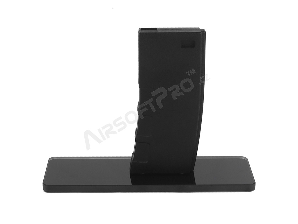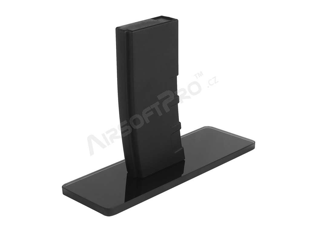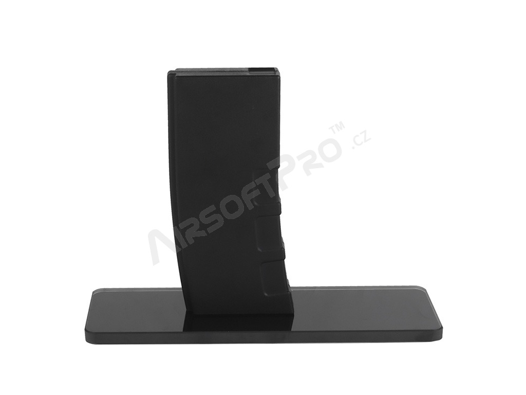Vďaka uchyteniu cez uvoľňovač zásobníka je možné zbraň do stojanu vložiť a zaistiť rovnakým spôsobom ako bežný zásobník. Sklenená základňa navyše elegantne podčiarkne vzhľad vystavenej zbrane. Telo zásobníka stojančeka je vyrobené z ABS plastu, zatiaľ čo základňa je zo skla pre maximálny vizuálny efekt.