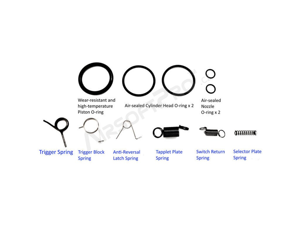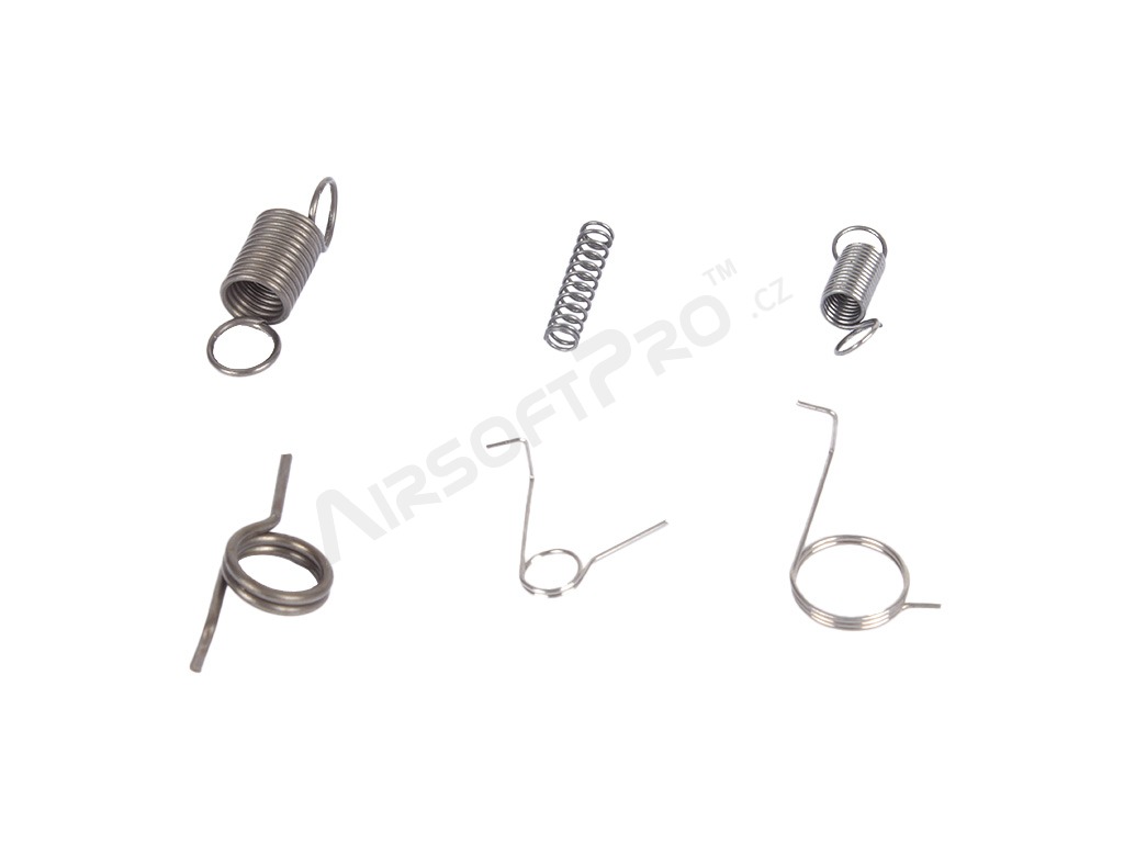 Opravná sada pre elektrické airsoftové zbrane M4 / MP5 [AimTop] Univerzálna sada obsahujúca náhradné pružiny mechaboxu V2 a O-krúžky, vyrobené z vysoko kvalitnej ocele a tepelne spracované na zabezpečenie optimálnej pružnosti.