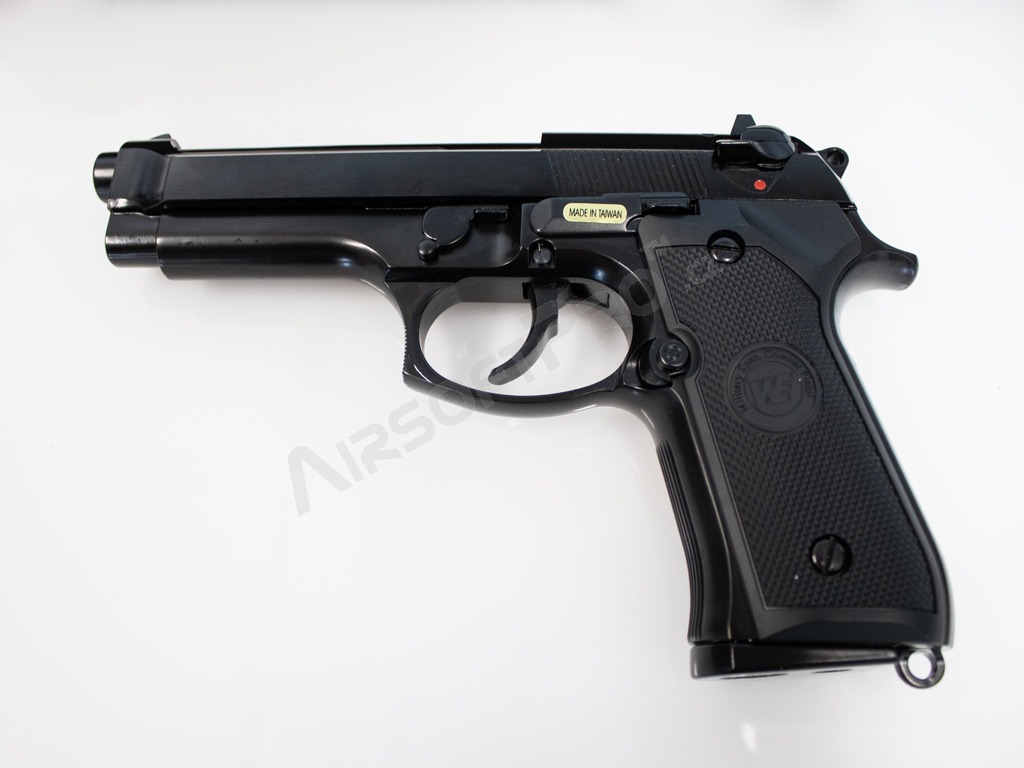 Perfektne prepracovaná a celokovová replika klasickej pištole M92. Jedná sa o plynovú zbraň a pri streľbe realisticky napodobňuje pohybom záveru streľbu. Tzv. Blow back systém. Plyn sa plní do zásobníka s kapacitou 25 guličiek.Na jedno naplnenie plynom je zbraň schopná vystrieľať cca 30-40 guličiek. Optimálna hmotnosť streliva je 0,20 - 0,23g. Jedná sa o zbraň druhej generácie.