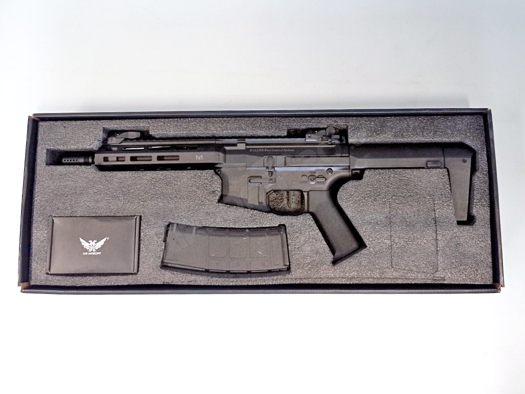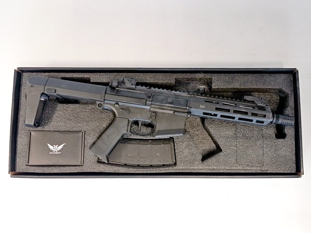 Moderná replika zbrane typu AR-15 v štýle "Honey Badger" od firmy Double Eagle. Zbraň ponúka kvalitné spracovanie tela i vonkajších dielov, vo vnútri mechaboxu je procesorová jednotka FALCON s nastaviteľnými funkciami, ktorá má v sebe aj mosfet. V prípade prepätia alebo naopak nízkeho napätia vydá motor varovnú vibráciu.