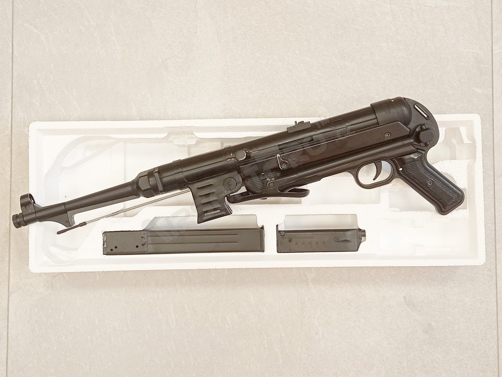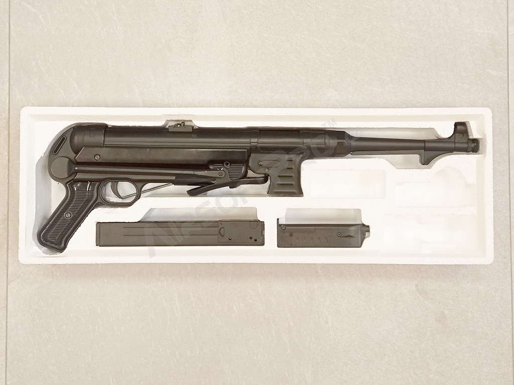 Druhoválečná nemecká klasika - MP40 Schmeisser. Táto veľmi vydarená replika v celokovovom prevedení má sklopnú pažbu a čierne pažbenie. Airsoftová zbraň je elektrická a schopná streľby ako jednotlivo, tak aj dávkou.