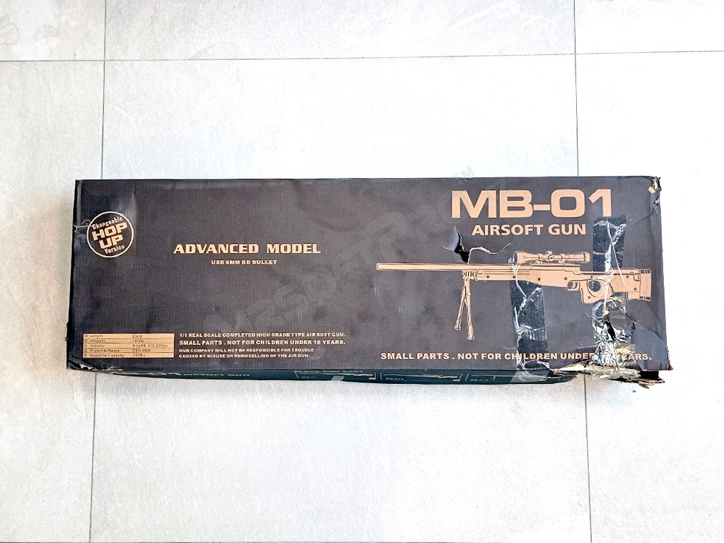 Veľmi výkonná manuálna puška Well MB-01. Jedná sa o Upgrade verziu upravenú priamo výrobcom Well. Obsahuje ním vložené zosilnené diely, ktoré zvyšujú výkon zbrane.Zbraň po výmene plastových dielov za kovové má teraz výkon cca 155 až 165 m/s(Až 540 FPS). Záver a hlaveň je kovová. Pažba je z odolného plastu. Súčasťou balenia zbrane je kovová sklopná dvojnožka aj kovový puškohľad s nastaviteľným priblížením 3-9x40 s krytkami. Odporúčané strelivo je 0,30 až 0,36g.