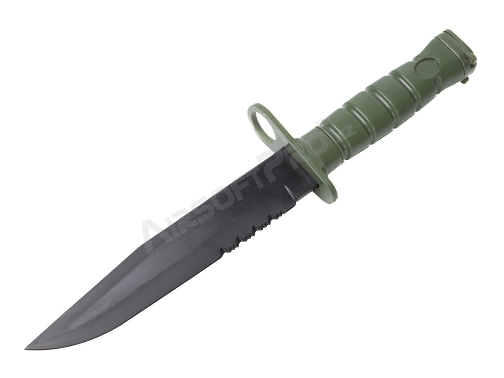 Realistická replika taktického bojového noža/bajonetu M10 s typickým plastovým puzdrom. Tento bezpečný cvičný nôž s gumovou čepeľou je ideálny pre airsoftové využitie, nácvik techník zblízka alebo ako štýlový doplnok výstroja.