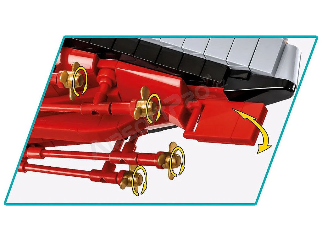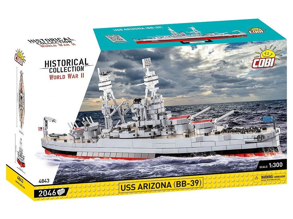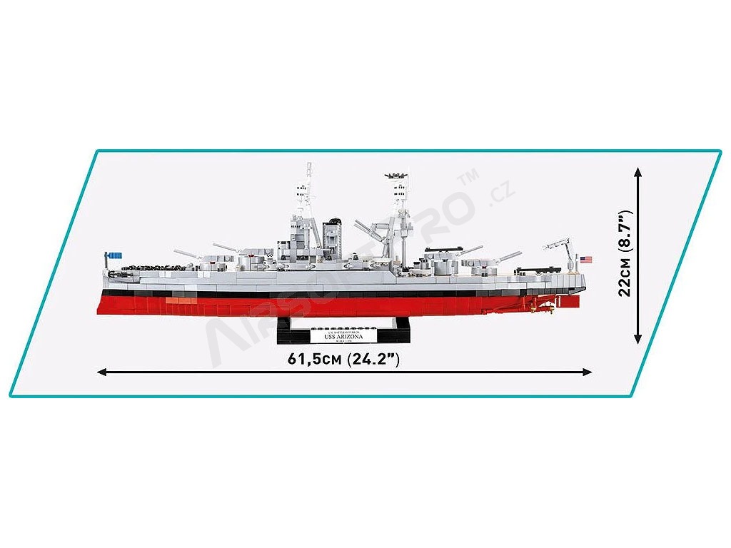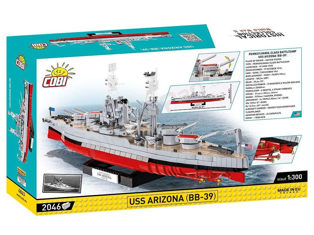 Stavebnica WW II USS Arizona BB-39 (1:300) [Cobi] USS Arizona je bojová loď, ktorá bola spustená na vodu počas prvej svetovej vojny. Počas svojej služby prešla loď modernizáciou. Arizona bola prítomná v Pearl Harbor počas japonského útoku 7. decembra 1941. Počas náletu došlo na palube lode ku katastrofickej explózii. Väčšina posádky zahynula a loď sa potopila, čím sa stala symbolom japonského útoku. Trosky bojovej lode neboli nikdy vyzdvihnuté. Prvky nadstavby vyčnievajúce nad hladinu vody boli odstránené, takže nad vodoryskou zostala iba barbeta tretej hlavnej delovej veže. V roku 1962 bolo na troskách otvorené mauzóleum USS Arizona. Slávna loď bola navrhnutá v mierke 1: 300 a je dlhá 24 palcov. Viac ako 2 046 kociek vám zaistí hodiny vzrušujúceho stavania! Jasné a intuitívne pokyny vás týmto procesom ľahko prevedú. Táto zberateľská súprava obsahuje tehlový stojan, na ktorý môžete pripevniť štítok s názvom slávnej lode. Vďaka použitiu najnovších dostupných prvkov a pokročilých konštrukčných techník model verne odráža proporcie historickej lode a zachováva všetky jej podstatné prvky, vrátane originálneho, veľmi charakteristického tvaru trupu a nadstavby. Model má množstvo pohyblivých častí, ako sú: lodné skrutky, kormidlá, otočné veže a hlavne diel, ktoré je možné zdvíhať a spúšťať.