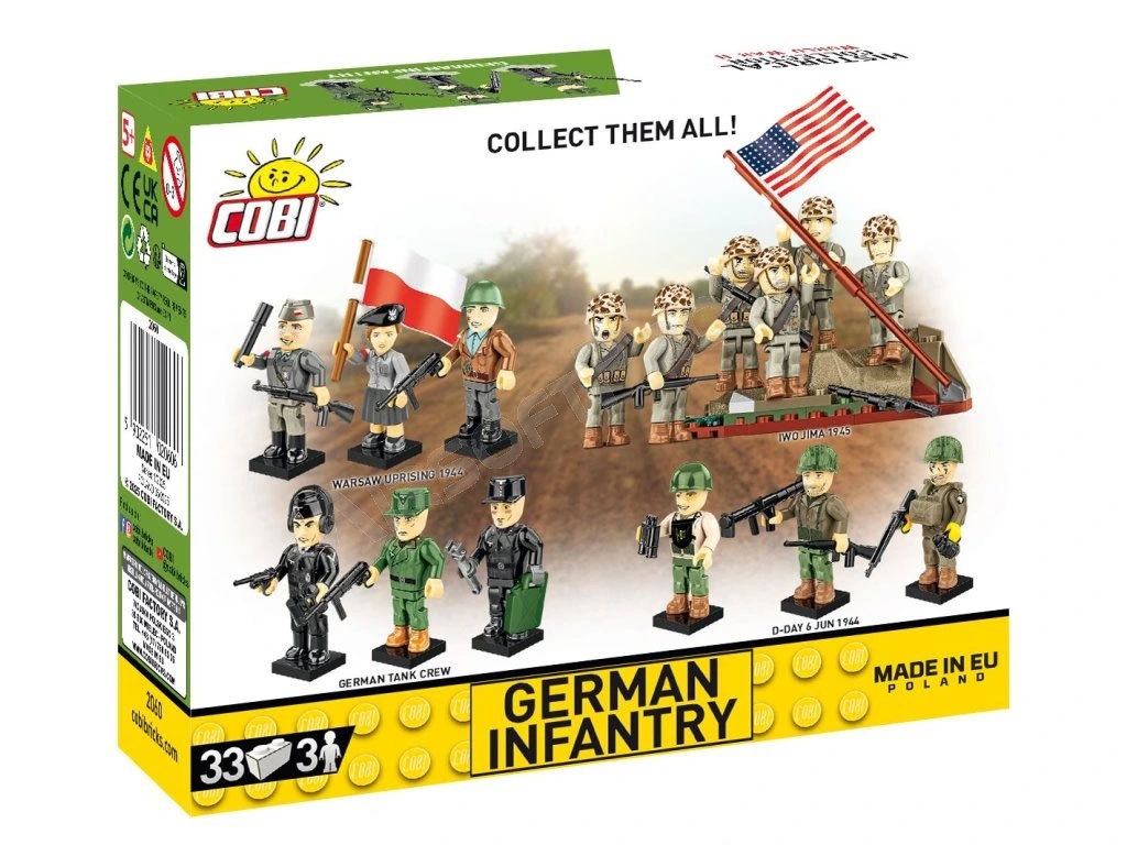 3 figúrky s príslušenstvom Nemecká armáda [Cobi] Sada figúrok obsahuje dve realisticky spracované postavy nemeckých pešiakov a jednu figúrku horského poľovníka z obdobia 2. svetovej vojny.