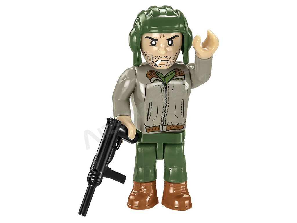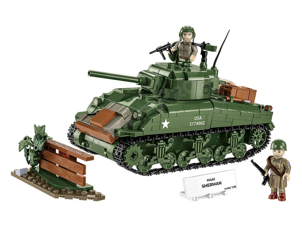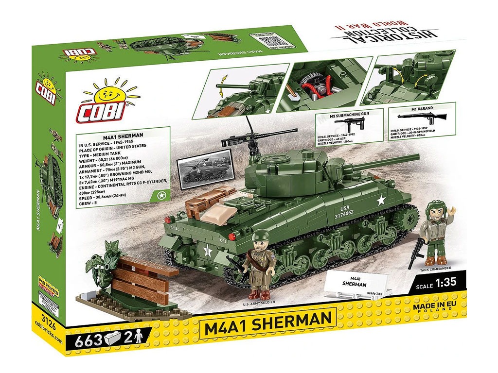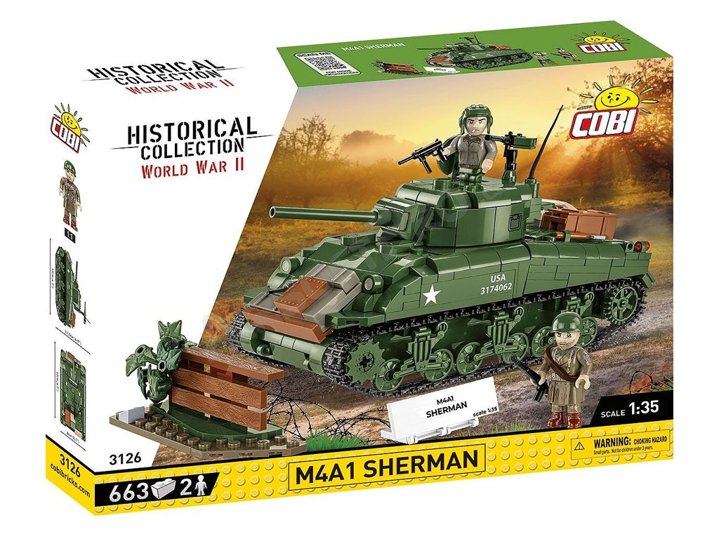 Stavebnica WW II M4A1 Sherman (1:35) [Cobi] M4 Sherman bol základný americký stredný tank vyrábaný počas 2. svetovej vojny. Táto stavebnica COBI je starostlivo navrhnutá v mierke 1:35 a skladá sa zo 663 kociek. Tank má funkčné pásy, otočnú vežu, pohyblivý kanón, otvárací poklop a servisný kryt s maketou motora vo vnútri. Súčasťou sady sú dve figúrky – americký tankista s helmou a samopalom M3 „Grease Gun“ a pešiak oblečený do teplého kabátu s puškou M1 Garand. Je doplnený o prvky prostredia: úsek plotu so živým kríkom, ktorý dodáva zostave atmosféru bojového poľa. Potlače na modeloch sú veľmi kvalitné, realistické a presne zachytávajú značenie tanku aj detaily uniforiem.