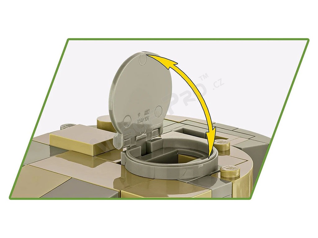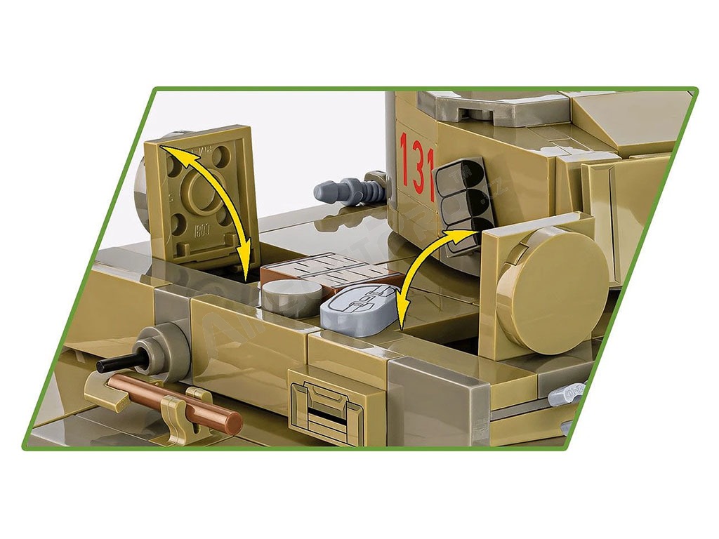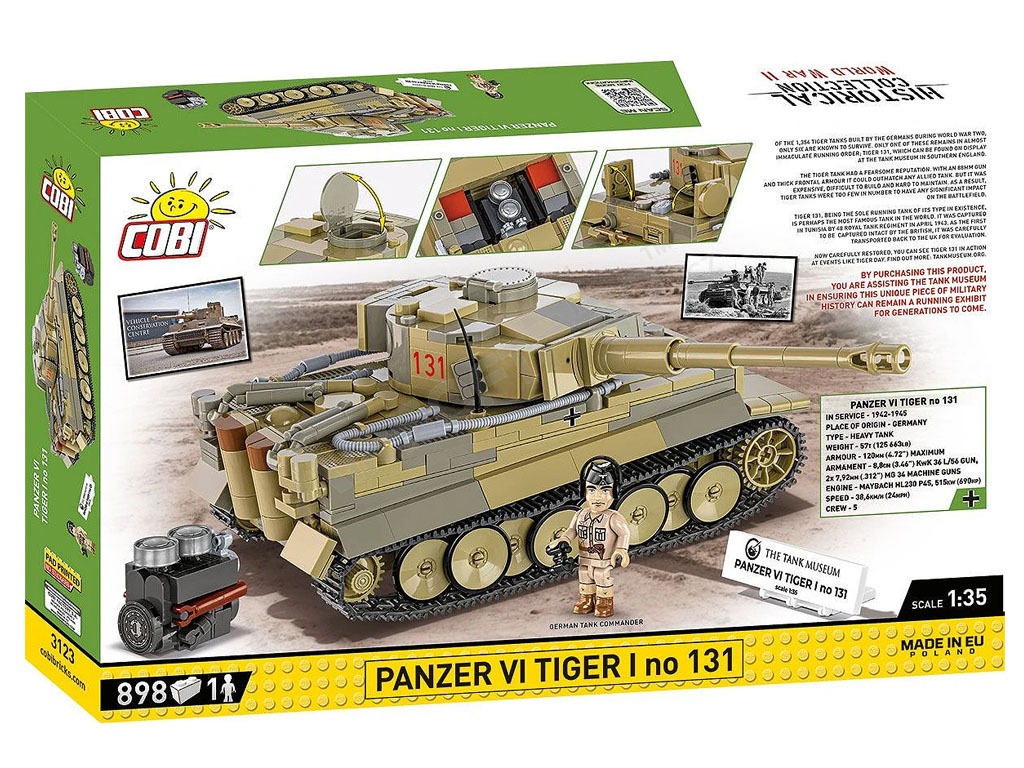 Náš Tiger 131 bol reprodukovaný s dôrazom na detail vo veľmi obľúbenom meradle 1:35! Stojí za zdôraznenie, že je to prvýkrát, čo COBI vydáva legendárny Tiger 131 v tejto veľkosti! Model má pohyblivé prvky, ako je veža a hlaveň delá, a tiež otočné kolesá a pásy. Prepracovaná sada sa skladá z 898 prvkov a verne odráža pôvodné tvary svojej historickej inšpirácie. Náš výkonný tank je pokrytý vysoko kvalitnými potlačami, ktoré sa nestierajú. Osobitnú pozornosť si zaslúžia farby, ktoré sa blížia originálu, a vďaka nim model vyzerá oslnivo! Súprava obsahuje model motora Maybach, ktorý je možné vystaviť vedľa modelu alebo umiestniť do tanku pod servisný kryt. Model má pohyblivé kolesá a pásy zložené z mnohých článkov. Počas hry môžete tank riadiť a sledovať fungujúcu trakciu pásov! Poklopy sa otvárajú a pod nimi je priestor pre štandardné figúrky COBI. Figúrka predstavuje veliteľa tanku v tropickej uniforme. Celú sadu dopĺňa biela plaketa s vytlačeným názvom tanku a logom Tankového múzea!