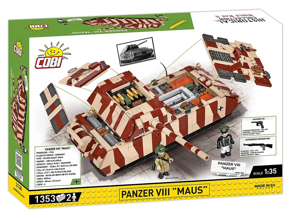 Stavebnica WW II Panzer VIII MAUS (1:35) [Cobi] Model najväčšieho tanku v histórii - PANZER VIII MAUS! Postavte si vlastného obra z 2. svetovej vojny! Objavte silu tajných projektov Tretej ríše a vytvorte model superťažkého tanku, ktorý mal ovládnuť bojisko! Panzerkampfwagen VIII Maus nie je len najväčším tankom na svete - je to fascinujúci kus histórie.