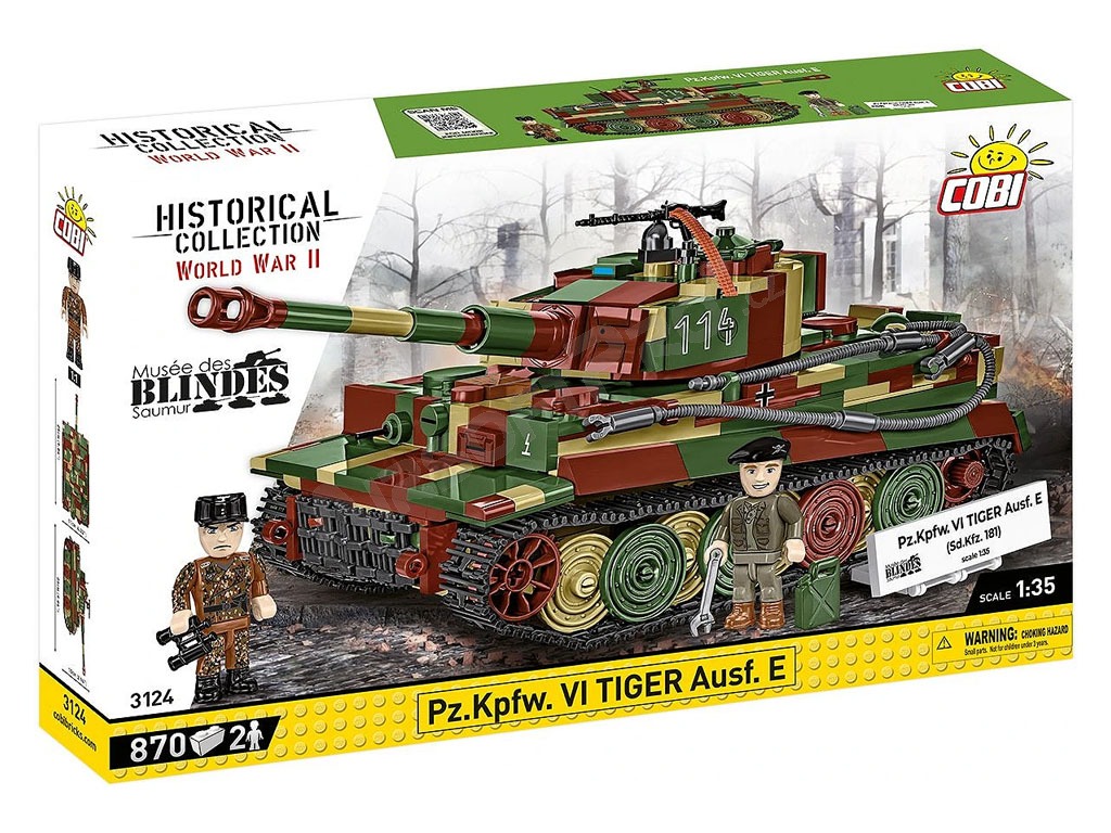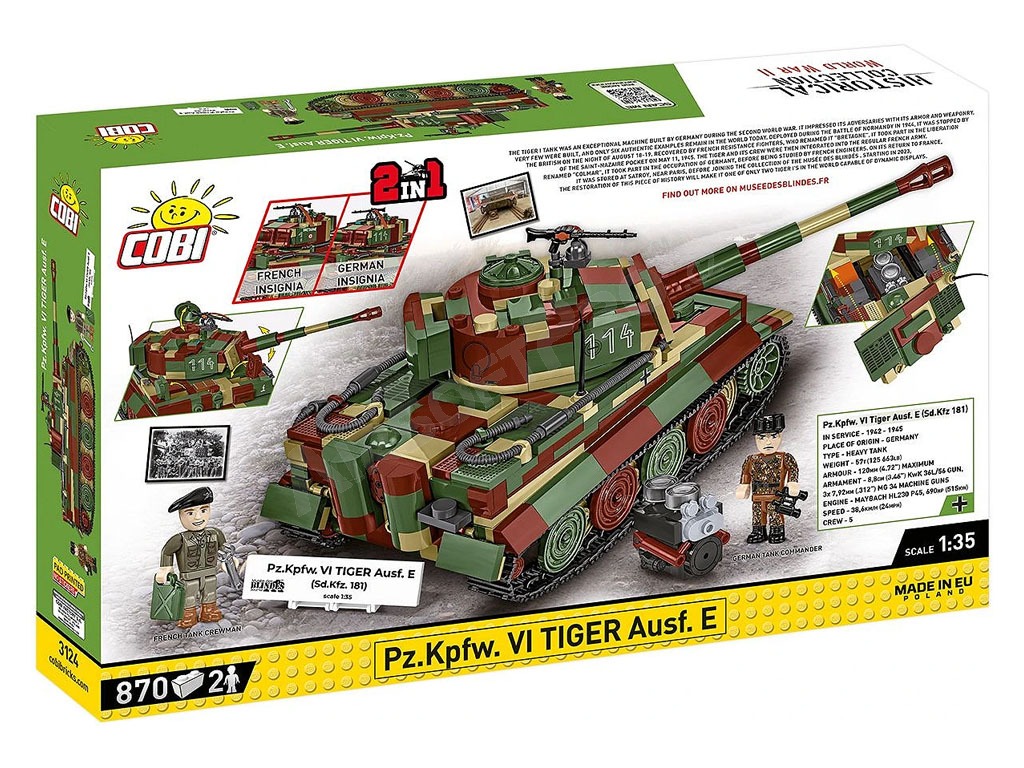 Stavebnica WW II PzKpfw VI Tiger Ausf E, 2v1 (1:35) [Cobi] Tiger I bol nemecký ťažký tank používaný počas 2. svetovej vojny. Bol známy svojou silnou výzbrojou a pancierovaním. Verzia Ausf. E je jednou z najikonickejších variantov tohto stroja. Skutočný Tiger, ktorý inšpiroval túto stavebnicu, je súčasťou zbierok slávneho Musée des Blindés vo francúzskom Saumure.