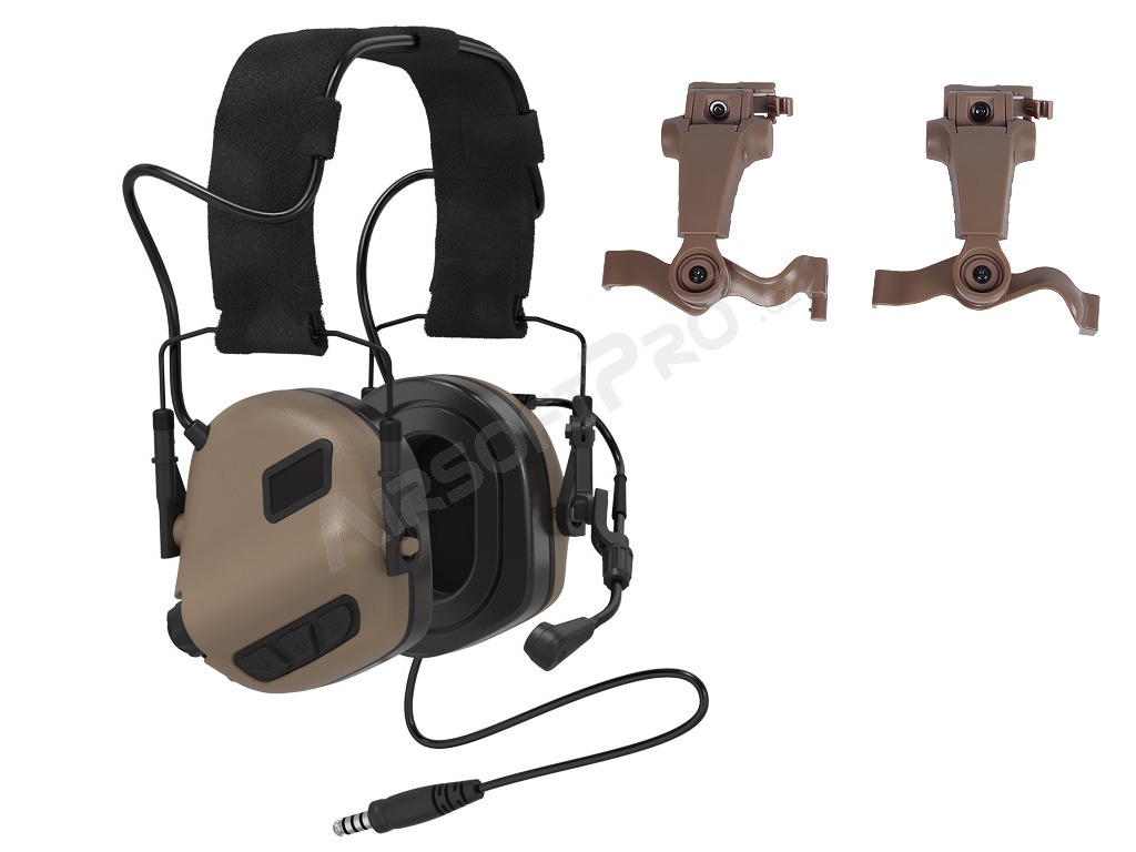 Elektronická slúchadlá Earmor M32X PLUS ARC - Coyote Brown [EARMOR] Sada EARMOR M32X PLUS obsahuje slúchadlá s mikrofónom EARMOR M32 PLUS a montáž na helmu M16A s lištou ARC (napr. pre FAST alebo MICH helmu).