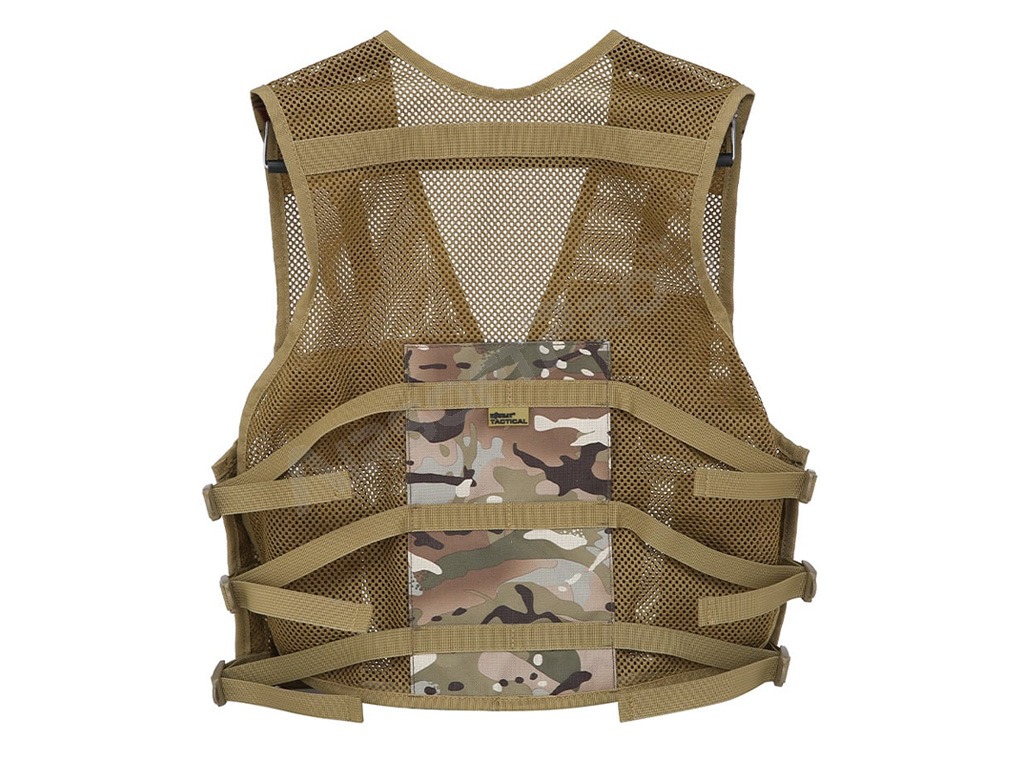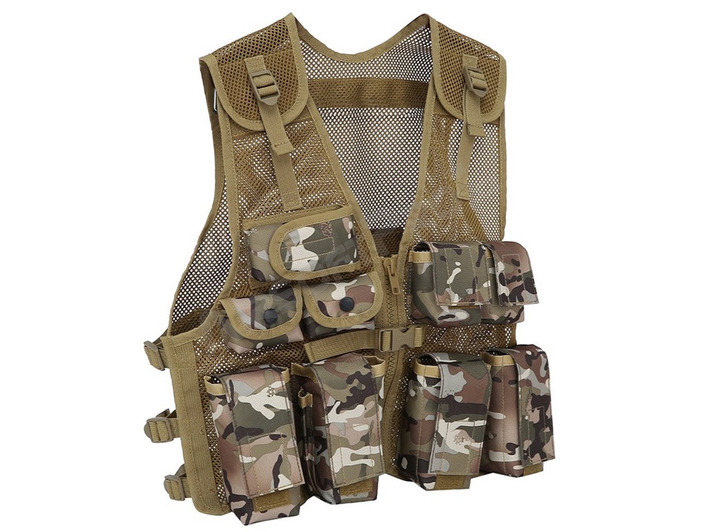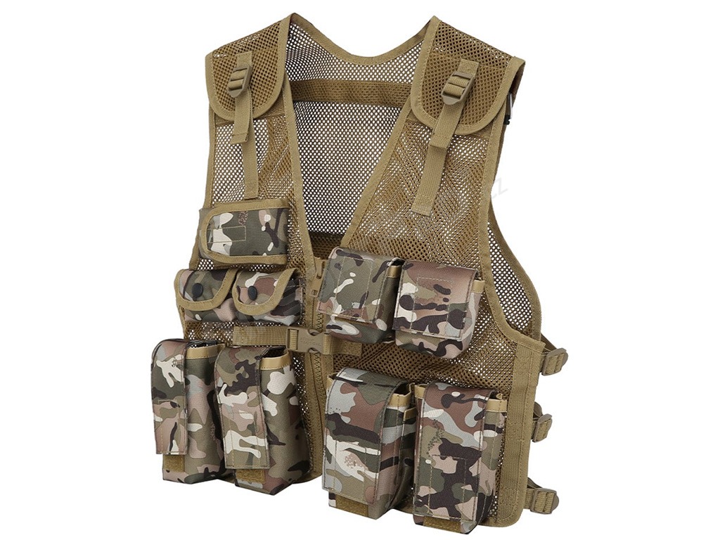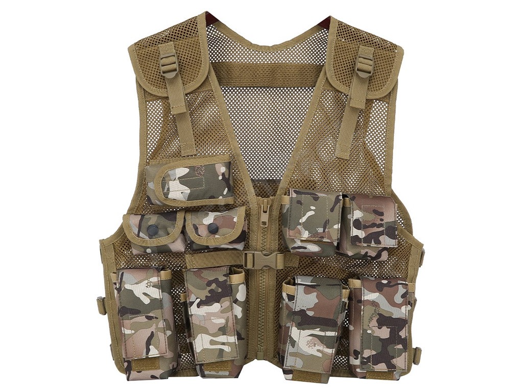 Detská útočná vesta sa vyznačuje ľahkou priedušnou sieťovinou s nastaviteľnými popruhmi na ramenách, vpredu a po stranách. Má zapínanie na zips s rýchloupínacou prackou a 9 vreciek na prednej strane. Vesta je vyrobená z materiálu 600D Tac-Poly, vďaka čomu je pevná a odolná a má univerzálnu veľkosť.