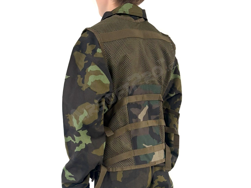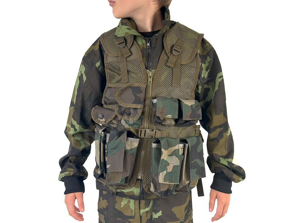 Detská taktická vesta na zásobníky a príslušenstvo. Vyrobená zo 100% polyesteru v maskovacím vzoru. V prednej časti sa nachádza štyri dvojité sumky pre zásobníky typu M4. Nad nimi sú menšie vrecká na ďalšie príslušenstvo. Všetky sa zatvárajú na suchý zips. Okrem strednej chrbtovej časti je vesta zo sieťoviny. Ramenné popruhy sú nastaviteľné. Rovnako tak obvod možno nastaviť pomocou sťahovacích popruhov. Je možné nastaviť obvod pásu od 64cm do 88cm. Vesta sa zapína masívnym zipsom a istený plastovou sponou.
