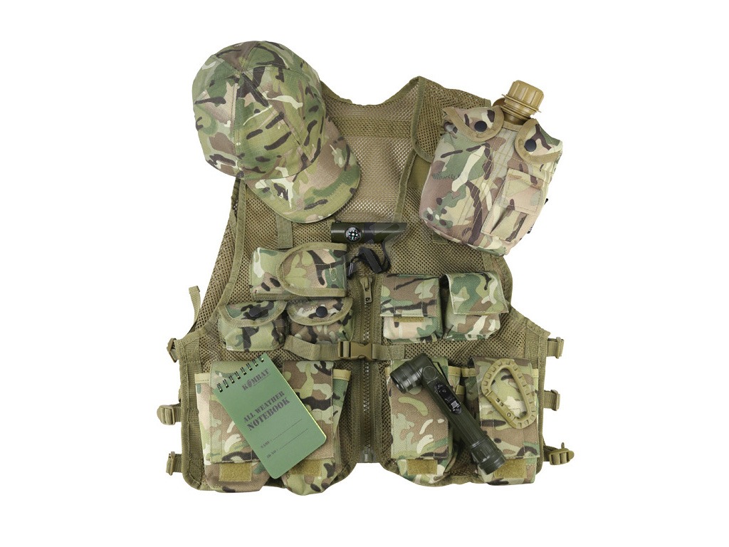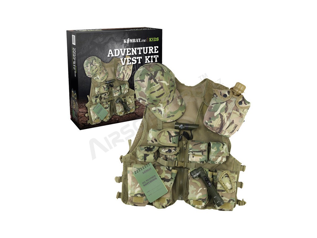 Detská sada vesty Adventure v maskovacom vzore BTP (British Terrain Pattern - obdoba Multicam vzoru).