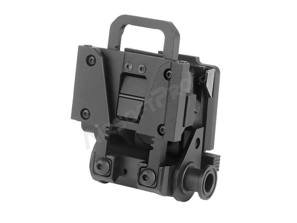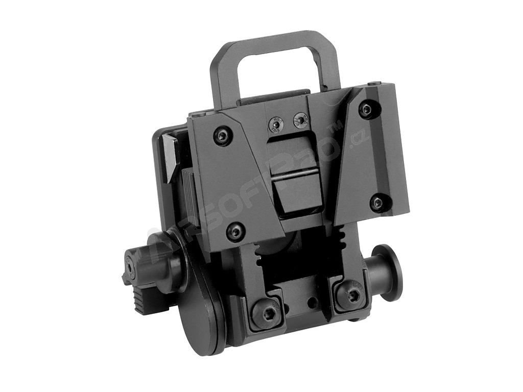 Montáž sa inštaluje priamo na montážnu platformu helmy. Je kompatibilný s bežne používanými NVG zariadeniami určenými pre airsoft a repliku vojenského vybavenia. Vďaka možnosti nastavenia uhla a výšky je možné optimalizovať pozíciu NVG tak, aby vyhovovala ergonómii užívateľa aj typu použitia.