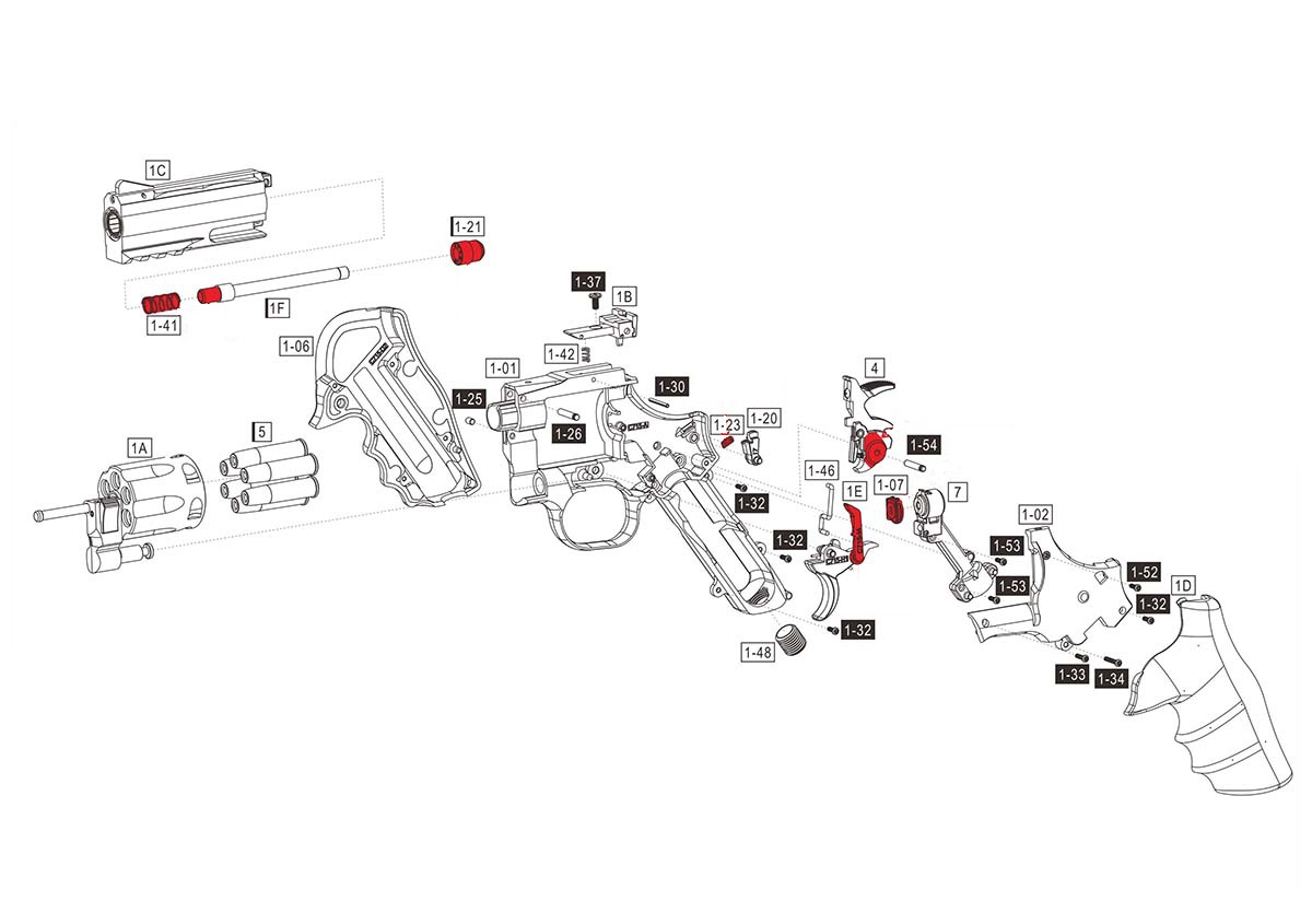 Revolver je vybavený dvojčinnou spúšťou (Double-action), tzn. jedným stiknutím spúšte dôjde k pootočeniu bubienka, natiahnutiu kohútika a výstrelu. Pre presnejšiu streľbu je možné kohútik natiahnuť samostatne a stlačením spúšte iba vystreliť. Chod spúšte je v tomto prípade výrazne kratší a hladší a zmenšuje sa riziko, že si pri výstrele zbraň „strhnete“ do strany.