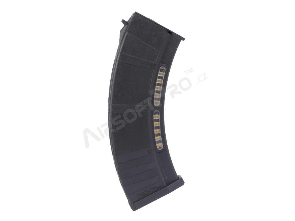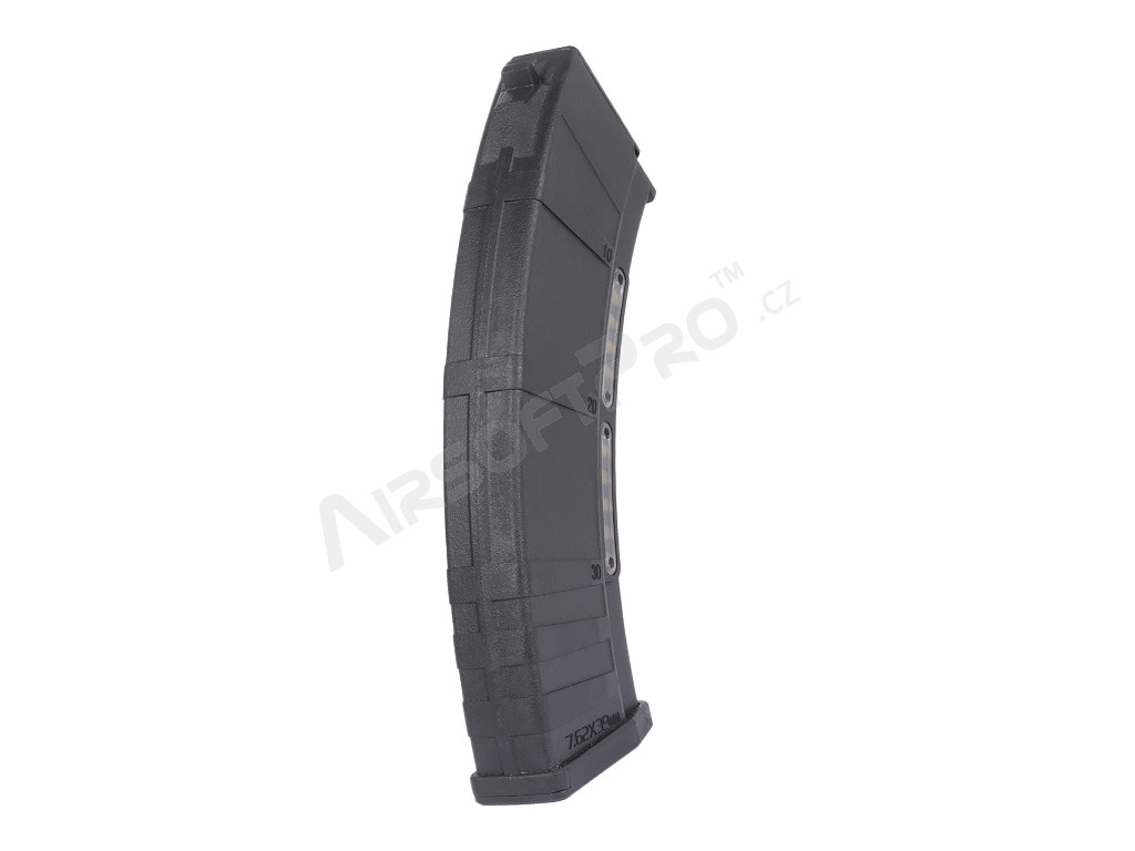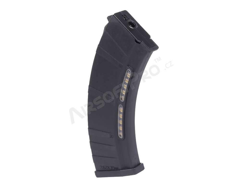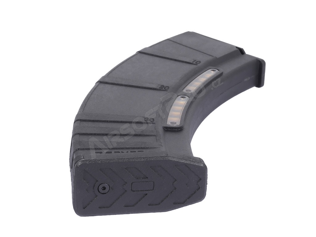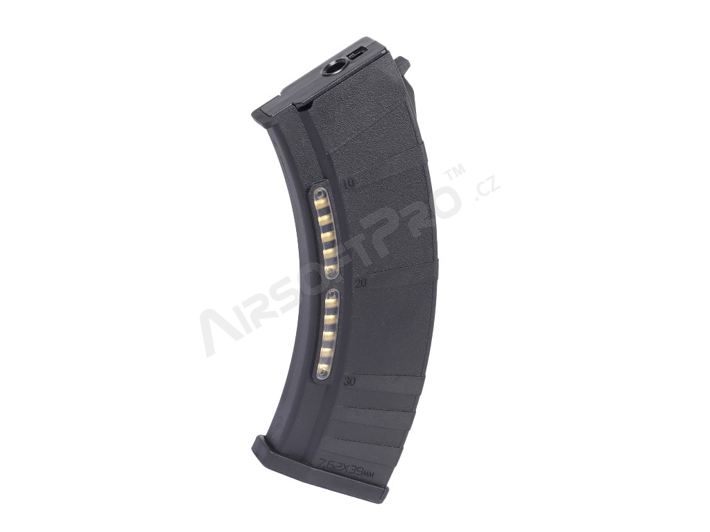 Ergonomický tvar zaistí bezpečné uchopenie pri prebíjaní. Vhodné pre drvivú väčšinu airsoftových elektrických AK. Je vyrobený z odolného plastu s priehľadmi na imitáciu nábojníc.